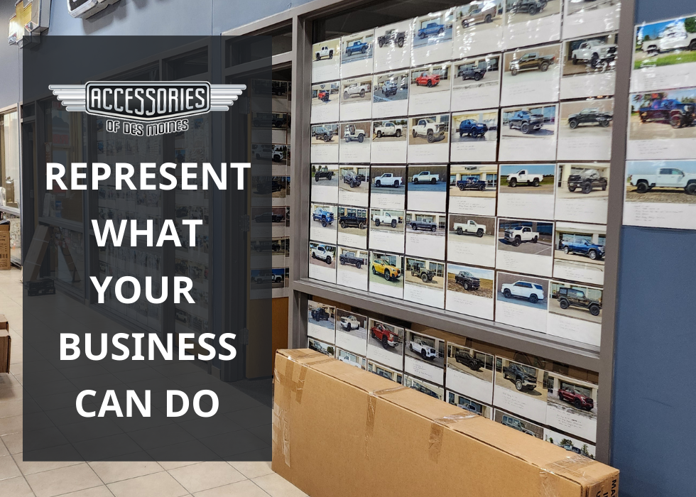 Bare walls feel empty. Random posters feel outdated. With vehicle photos and brand visuals, your shop can represent what your business can actually do. A truck owner sees a bed cover on a similar truck and starts asking questions. A Jeep owner sees an installed accessory and imagines their own build. This shortens the sales process by getting customers engaged just by stepping through the door.